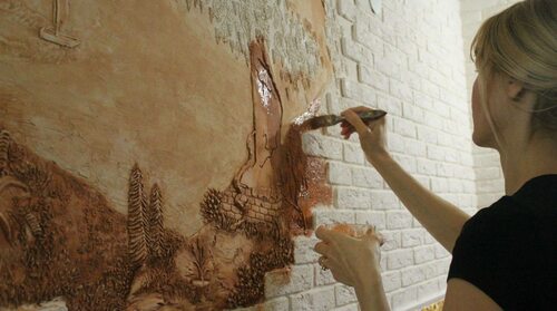 4. Имитация натуральных материалов. Рисунок на штукатурке может имитировать древесные текстуры, камень или кирпич, добавляя уют и природность в интерьер.