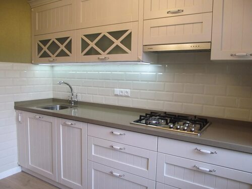 Один из самых популярных вариантов фартука для прямой кухни - это плитка. Она прочна, легко моется и доступна во множестве цветов и текстур. Фартук из плитки добавит кухне элегантность и станет прекрасным акцентом в интерьере.