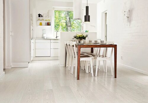 Ламинат с дубовым или ясеневым рисунком отлично подходит для кухонного интерьера. Он создает эффект натурального деревянного пола, сохраняя при этом преимущества ламината: прочность, долговечность и легкость ухода. Светлый ламинат визуально увеличивает пространство и придает кухне светлоту и уют.