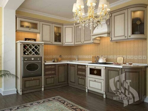 При создании комбинированной кухни в классическом стиле можно использовать различные виды дерева, мрамор, стекло и металл. Классические фасады, изысканные ручки и фурнитура добавят шарма и роскоши интерьеру.