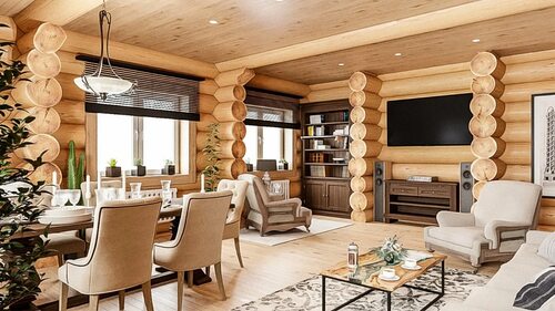 Кухня гостиная в доме из оцилиндрованного бревна