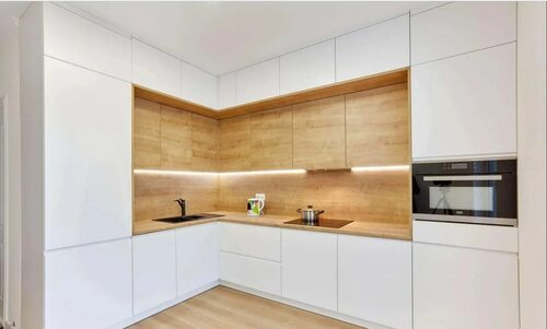 Угловые кухни обладают рядом преимуществ, таких как эффективное использование пространства, большое количество рабочих поверхностей, а также возможность размещения большого количества хранения. Белые фасады придают кухне светлоту и простор, а деревянные элементы добавляют тепла и уюта.