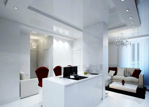 Белый натяжной потолок создает ощущение простора и света в помещении. Он отлично сочетается с любым стилем интерьера, придавая ему свежий и современный вид. Белый потолок также позволяет легко играть с цветовой палитрой и освещением, что делает его универсальным решением для дизайна помещений.