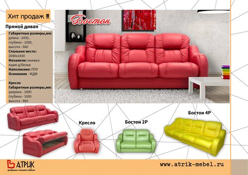 Ниже представлены многочисленные фотографии дивана Бостон прямого от Ульяновской фабрики. Вы можете оценить его внешний вид, размеры, цветовые решения и другие детали.