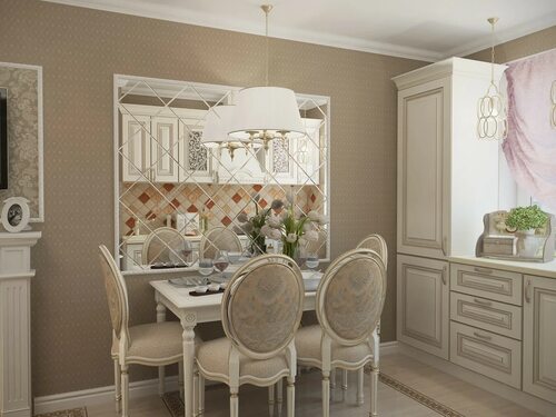 Для создания элегантного классического интерьера кухни часто используют обои с изысканными узорами, а также фрески, имитирующие декоративные элементы. Обои с золотыми или серебряными узорами, а также фрески с изображением растительных мотивов и архитектурных элементов могут придать стенам особую изысканность.